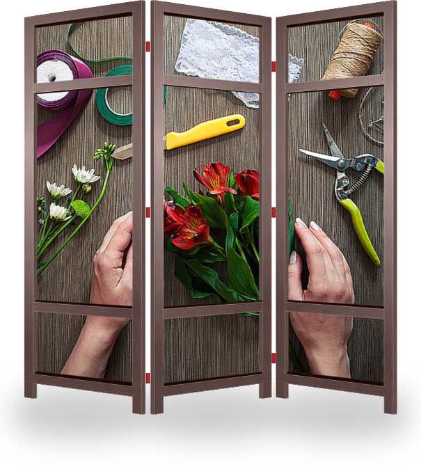 Описание ширмы Данная фотокарточка, передает весь спектр деятельности флориста. Работа с цветами, составление композиций, обработка цветка.