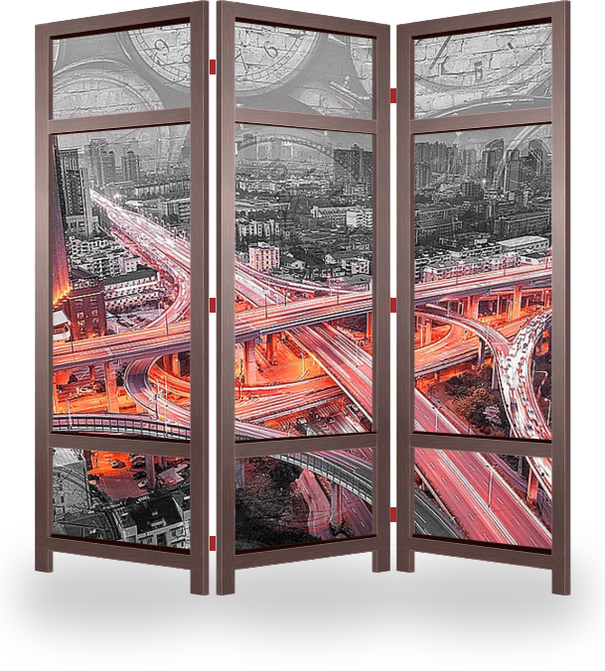 Описание ширмы Картина с изображением городского шоссе в Ханчжоу, с яркими огнями ночного движения в черно-белом решении украсит вашу гостиную.