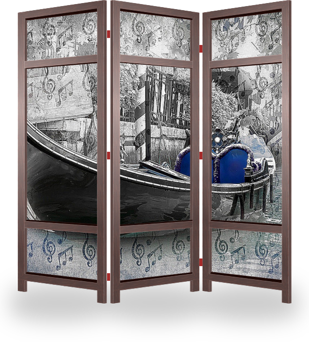 Описание ширмы Картина с изображением гондолы на воде в Венеции на фоне музыкальных нот в монохромном решении украсит любую комнату.