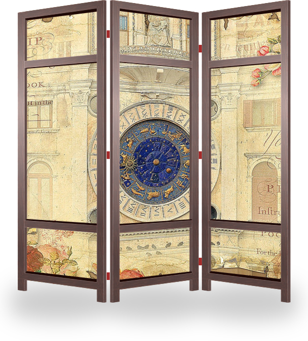 Описание ширмы Картина с изображением Венецианских астрологических часов в ретро стиле и цветах станет главным украшением любой комнаты.