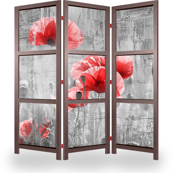 Описание ширмы Картина с изображением красных маков в поле в монохромном цветовом решении станет главным украшением вашей гостиной.