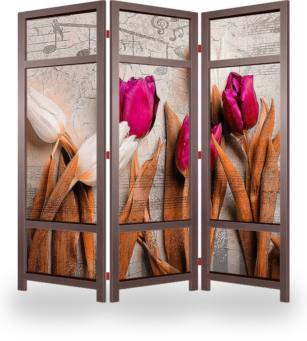 Описание ширмы Картина с изображением ярких бардовых и белоснежных тюльпанов на винтажном фоне станет главным украшением любой комнаты.