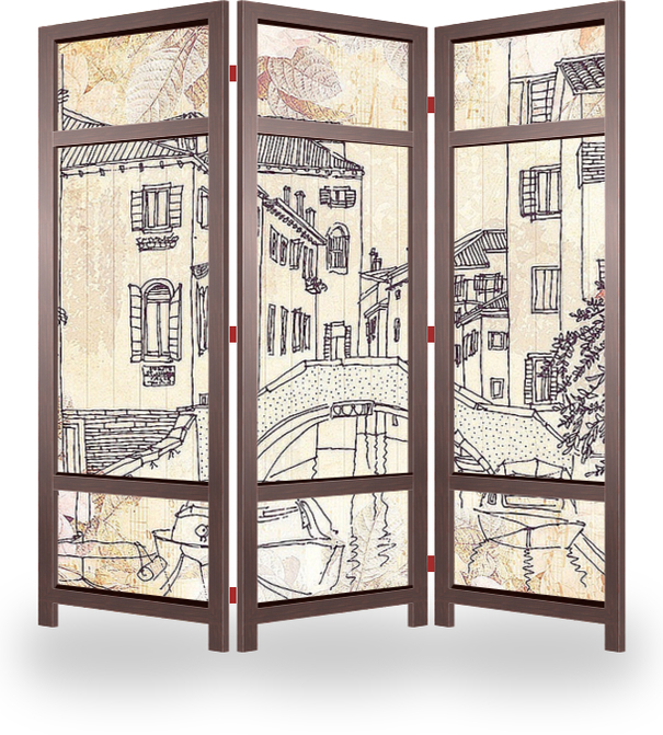 Описание ширмы Картина с изображением моста в Венеции, Италия, в технике рисунка от рука, в окружении акварельных цветов, украсит любую комнату.