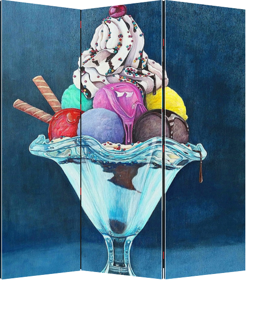 Описание ширмы Акрил, оргалит, 54х84 см. 2015. Мороженое – один из самых любимых десертов и у детей, и у взрослых. Картина "Сладости для пчелы" создаст настроение и подойдёт для декорирования кафе, кондитерской или семейного ресторана.