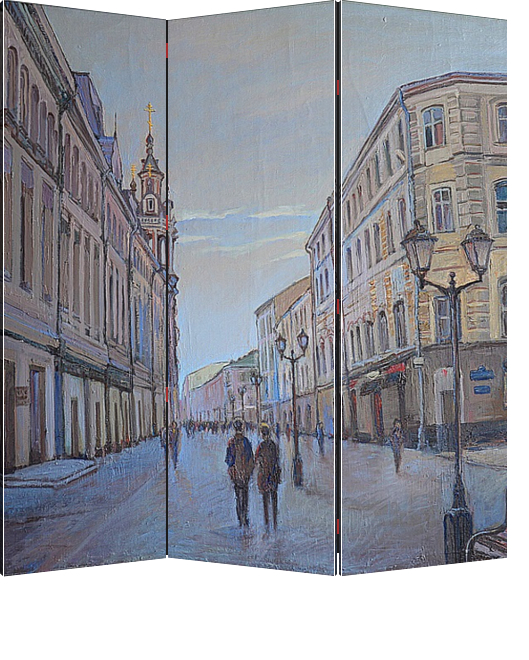 Описание ширмы На картине изображена Никольская улица, одна из центральных улиц Москвы. Романтическая сцена в сочетании со старинной архитектурой, предаёт работе мягкость и тёплые воспоминания о прогулках по городу. Холст/Масло 2013 год. размер: 80 х 100 см.