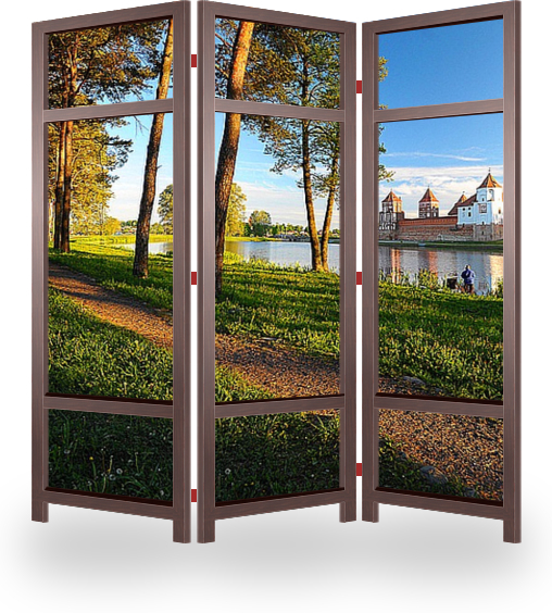 Ширма эконом отлично подойдет для временного размещения, рекламы, для отгораживания объектов интерьера и его дополнения. Лицевая сторона с изображением, обратная сторона открытый каркас