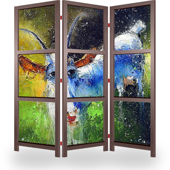 Описание ширмы Работа выполнена на льняном холсте ( производство Вышний Волочёк ) на подрамнике, корпусный, акриловый подмалевок + масло ( Италия/Голландия ), работа выполнена в оригинальной технике ( Know how ) присущей только Игорю Медведеву.
