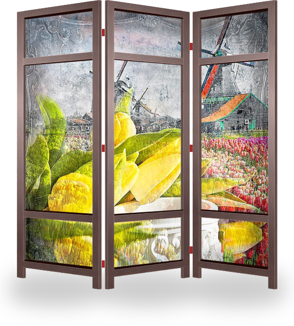 Описание ширмы Изображение желтых тюльпанов на фоне мельниц прекрасно украсит ваш интерьер, добавит нежности и света. Подойдет для спален, гостиных, прихожих.