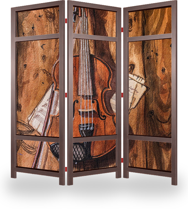 Описание ширмы Скрипка Шерлока Холмса, картина выполнена в акварельной технике. Скрипка лежит на столе