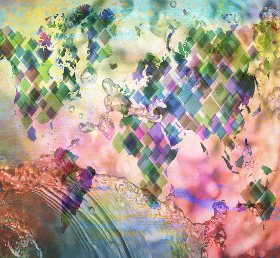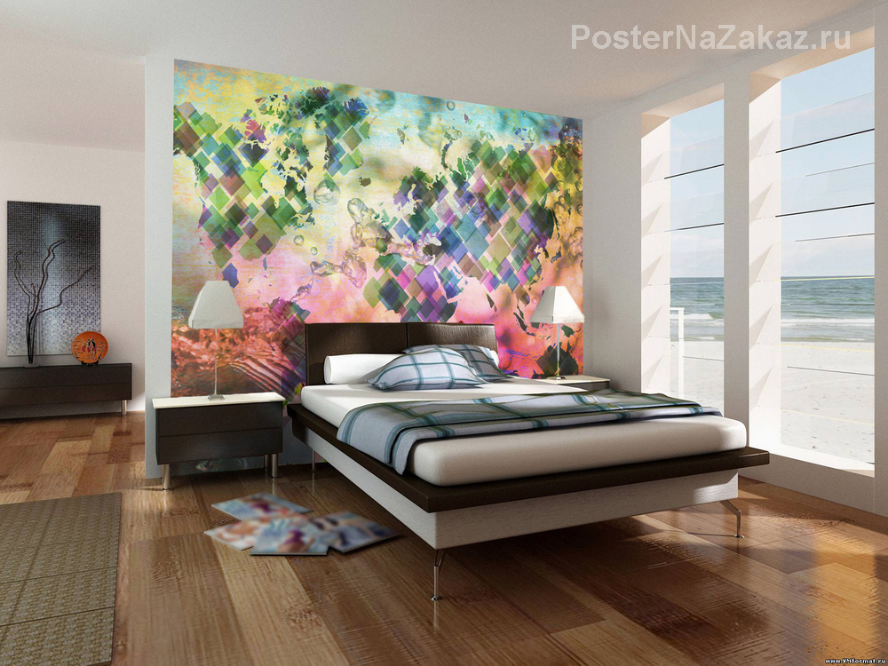 Яркое изображение карты мира из ромбов на фоне брызг воды станет ярким акцентом в интерьере вашей комнаты.