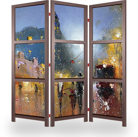 Описание ширмы Работа выполнена на льняном холсте ( производство Вышний Волочёк ) на подрамнике, корпусный, акриловый подмалевок + масло ( Италия/Голландия ), работа выполнена в оригинальной технике ( Know how ) присущей только Игорю Медведеву.