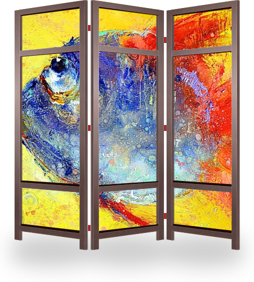 Описание ширмы Работа выполнена на льняном холсте ( производство Вышний Волочёк ) на подрамнике, корпусный, акриловый подмалевок + масло ( Италия/Голландия ), работа выполнена в оригинальной технике ( Know how ) присущей только Игорю Медведеву.