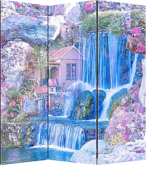 Описание ширмы Изображение в интерьере большого водопада среди камней и цветов возле маленького домика станет прекрасным дополнением вашей кухни.