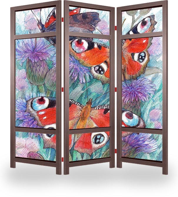 Описание ширмы На картине изображены бабочки дневного павлиньего глаза. Это одна из самых распространенных и, вместе с тем, самых ярких и красивых бабочек. Предпочитают сидеть на цветках репейника, бодяка, сивца, короставника, в общем, на самых обычных полевых цвет