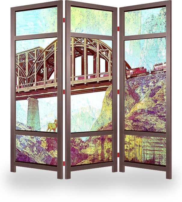 Описание ширмы Картина с изображением ж/д моста среди скал и гор с проходящим поездом в ретро стиле будет отлично смотреться в любой комнате.