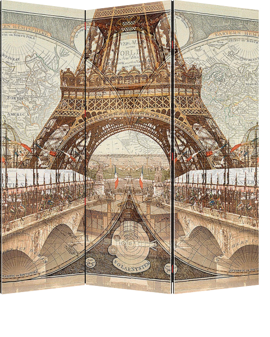 Описание ширмы Картина с изображением Эйфелевой башни и старинного моста в Париже на фоне карты мира в ретро стиле украсит и дополнит интерьер вашей комнаты.