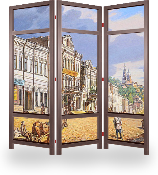 Описание ширмы Картина из серии "Старые города. Дореволюционная Россия". Реконструкция по старым фотографиям. Художник попытался представить атмосферу дореволюционного города ушедшей России. Находится в частной коллекции. Холст, масло. Размеры 180*75 см