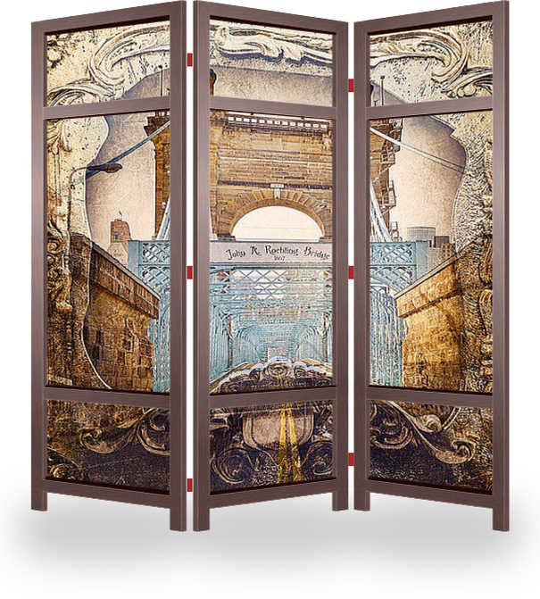 Описание ширмы Картина с изображением подвесного моста Roebling над рекой Огайо в Цинциннати в состаренной раме украсит и дополнит интерьер любой комнаты.