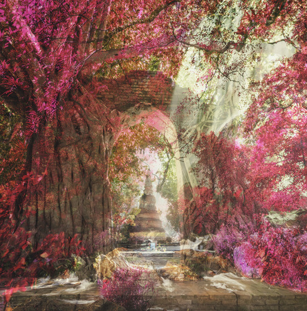 Фотообои с изображением необычного входа в сад в виде арки, скрывающийся на фоне веток с красными листьями сделает акцент в интерьере комнаты.