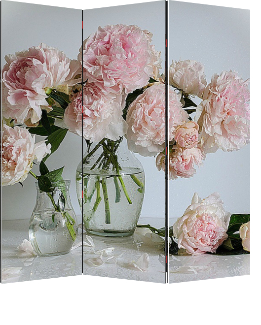 Описание ширмы Натюрморт с нежно-розовыми пионами в стеклянной вазе. Такой постер может украсить любое помещение в вашем доме или квартире и создаст в них особое настроение.