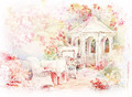 Изображение белоснежной беседки и чайного столика с креслами в сердце цветущего сада украсит и дополнит интерьер вашей кухни.