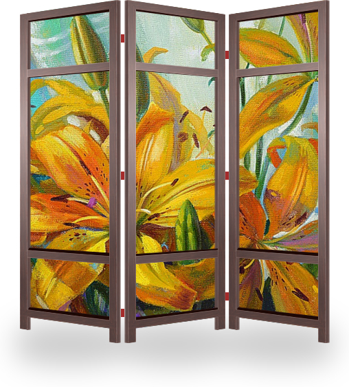 Описание ширмы Как озаряет солнце всё, к чему прикасается! Как прекрасны лилии на окне, золотые, чарующие! Просто необходимо было их запечатлеть!
