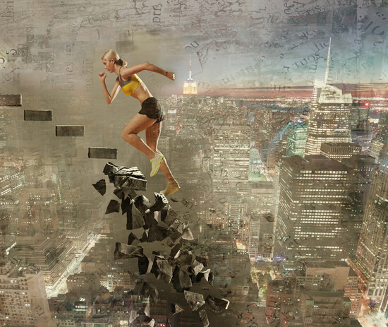 Девушка бегущая по лестнице, на фоне ночного города, такие фотообои подойдут для вашей гостиной или спальни.