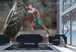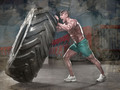 Сильный мужчина, во время тренировки, на фоне грузовиков, такие фотообои подойдут для спорт зала или гостиной, хорошо будут смотреться в интерьере в стиле лофт.
