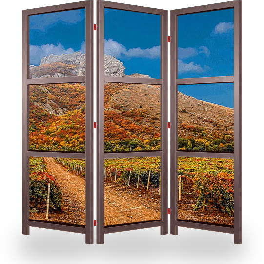 Описание ширмы Прекрасны и живописны осенние пейзажи с виноградниками Крыма. В Золотой балке зреют элитные сорта винограда,из которого производят отличное вино. Такой постер может украсить любое помещение вашего дома, офиса, отеля, ресторана, бара, турфирмы.