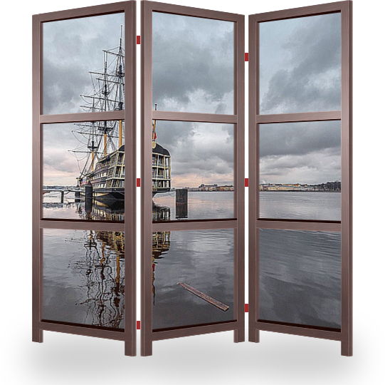 Описание ширмы "Благодать" — трёхмачтовый парусник, пришвартованный на Петровской набережной у Троицкого моста. Это историческая реконструкция трёхпалубного линейного корабля конца XVIII в.