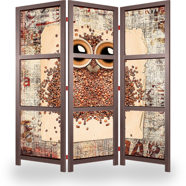 Описание ширмы Изображение милой и забавной совы из кофейных зерен и глазками из кружек кофе украсит интерьер любой спальни.
