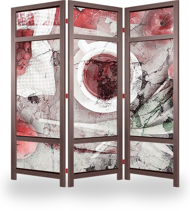 Описание ширмы Изображение легкого завтрака с букетом тюльпанов, кружкой кофе и малиной украсит интерьер любой спальни.