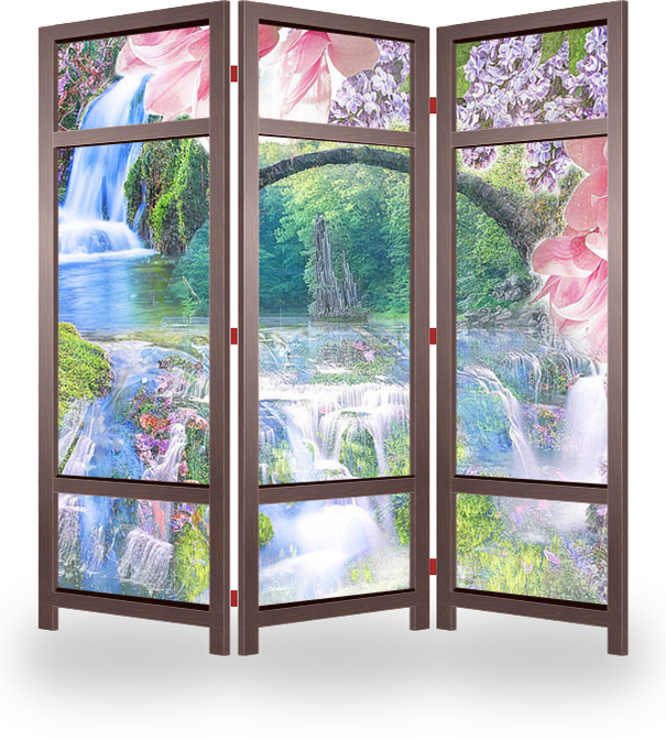 Описание ширмы Изображение каскадов из струящихся водопадов, в окружении гор и цветов прекрасно дополнит вашу гостиную, зал или спальню. Изображение цветов привнесет атмосферу праздника, а водопад придаст свежести вашему интерьеру