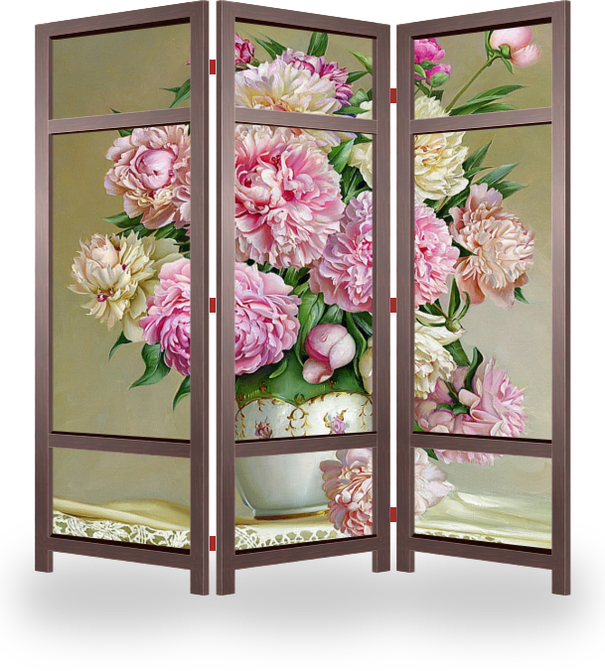 Описание ширмы На ажурной скатерти стоит букет красивых светло розовых и белых пионов