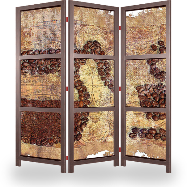 Описание ширмы Картина с изображением графина и чашки из зерен кофе на фоне карты мира станут украшением кухни или кофейни.