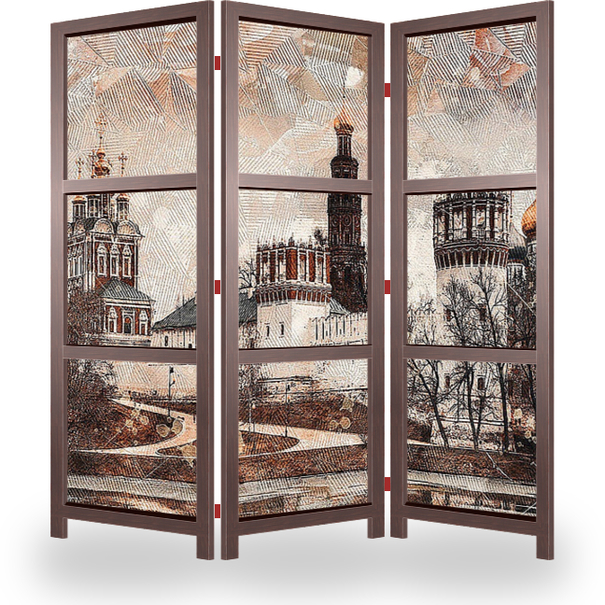 Описание ширмы Новодевичий монастырь в Москве. Стилизованная картина, преимущественно, в коричневых тонах, такая работа станет хорошим дополнением современного интерьера, подойдёт для гостиной или комнаты отдыха.