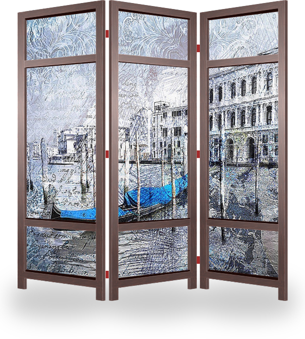 Описание ширмы Венеция, акцент на синей гондоле. Картина, преимущественно, в серых тонах, такая работа станет хорошим дополнением современного интерьера, подойдёт для гостиной или комнаты отдыха.
