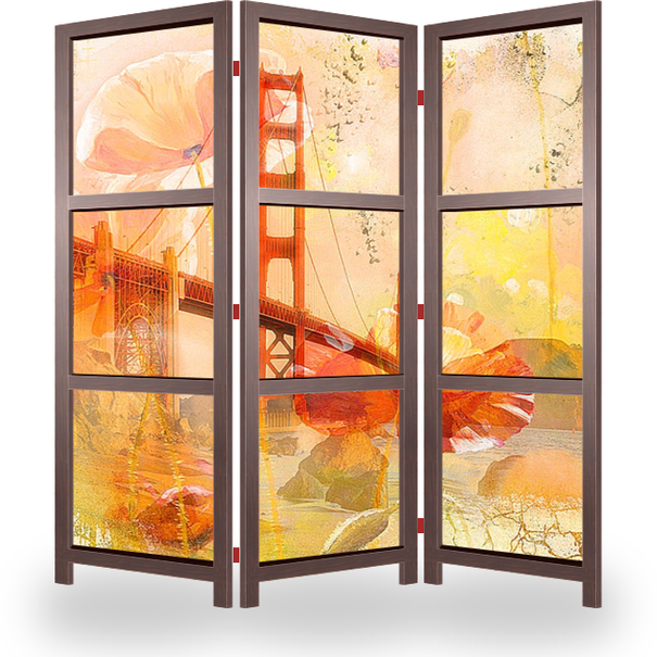 Описание ширмы Картина, изображающая Мост Золотые Ворота во время заката, окруженный красными маками прекрасное дополнение для ваших интерьеров. Замечательно подойдет для гостиных и спален оформленных в теплых тонах.
