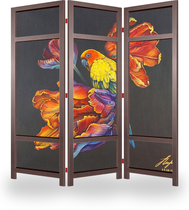 Описание ширмы Акрил, холст, 50х50 см. 2017. Эффектная картина "Попугайные тюльпаны" украсит помещение и добавит ему особый шарм.