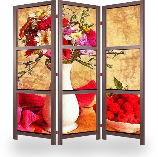 Описание ширмы На картине изображен букет красивых цветов и сочная малина. Картина выполнена в специальной графической технике под масляные краски