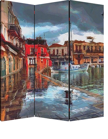 Описание ширмы На картине изображена пасмурная осенняя погода в тихом городке. Картина выполнена в специальной графической технике
