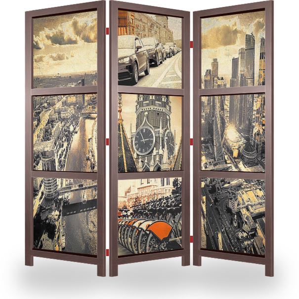 Описание ширмы Модульная картина с изображением различных архитектурных пейзажей Москвы в монохромном оформлении с яркими акцентами украсит и дополнит ваш интерьер.