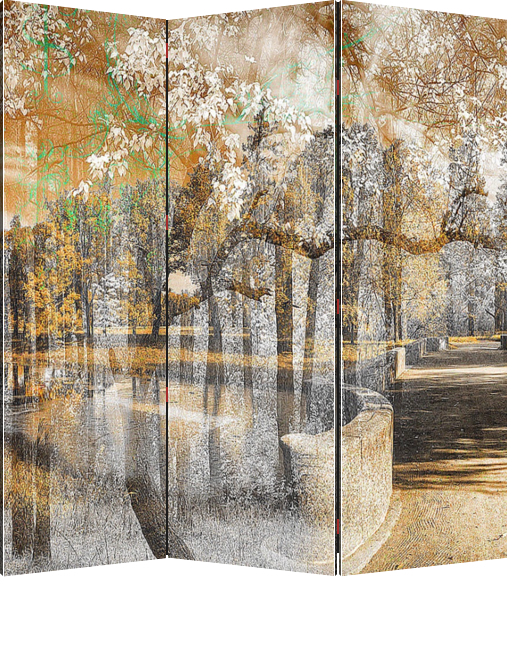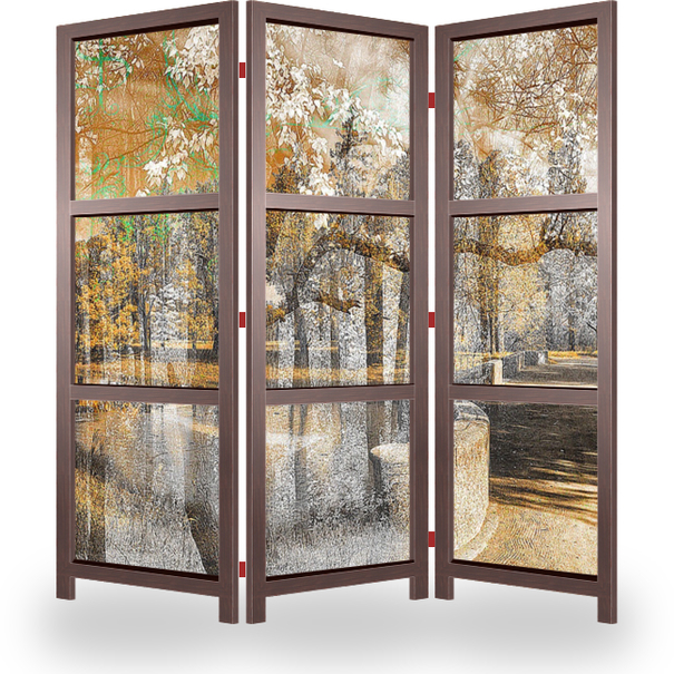 Описание ширмы Модульная картина с изображением стволов деревьев и тропинкой уходящей вглубь леса, отличное дополнение к оформлению вашей комнаты