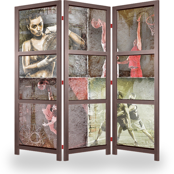 Описание ширмы Коллаж из изображений баскетбольных игроков придаст динамику и спортивную направленность интерьеру. Прекрасно подойдет для спортзалов, гостиных и спален молодых мужчин и девушек.