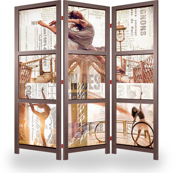 Описание ширмы Коллаж в стиле сепия добавит вашему интерьеру стиль и мягкость. Девушки застывшие в танце на улицах Нью-Йорка, прекрасное дополнение для спальни или гостиной.
