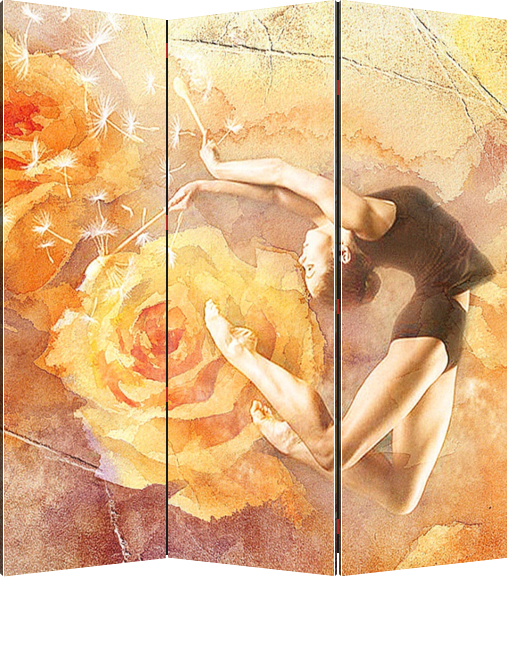 Описание ширмы Картина в мягких, нежных цветах добавит вашему интерьеру интересный и незабываемый элемент. Девушка изображенная в танце среди роз прекрасно дополнять спальню женщины, которая занимается балетом.