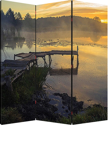 Описание ширмы Рассвет над туманной рекой.Место для рыбалки свободно и ждет рыболова! На мгновение солнце спряталось за облаками и снова появилось.