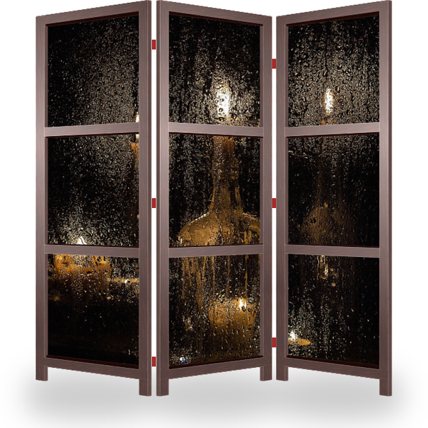 Описание ширмы Очередное моё упражнение в съёмке натюрморта за мокрым стеклом. Свечи очень хорошо смотрятся сквозь пелену дождя и потоки воды. Едва различимые силуэты бутылок придают картине загадочность и недосказанность.