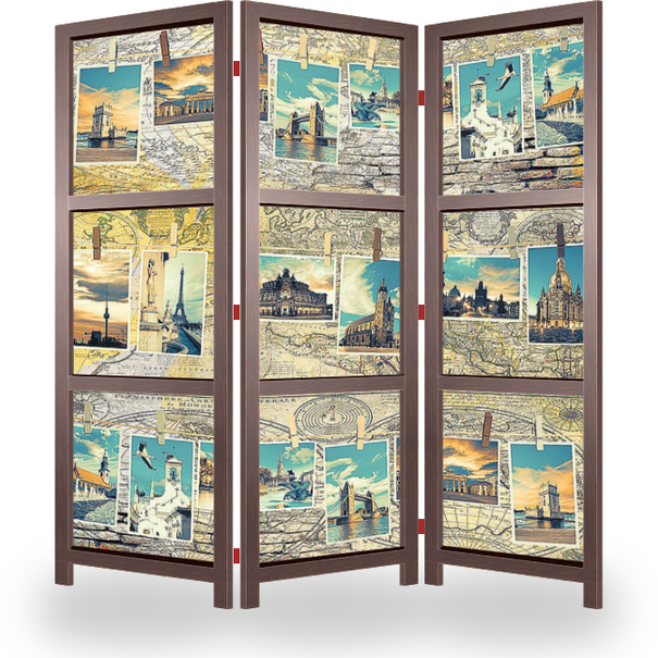 Описание ширмы Модульная картина с изображением фотографий памятников архитектуры на фоне карт мира украсит и дополнит ваш интерьер.