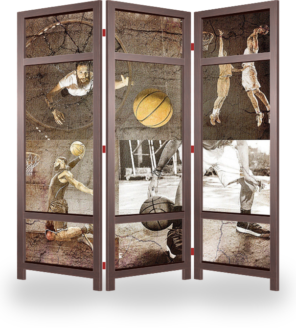 Описание ширмы Коллаж из изображений баскетбольных игроков придаст динамику и спортивную направленность интерьеру. Прекрасно подойдет для спортзалов, гостиных и спален молодых мужчин и девушек.